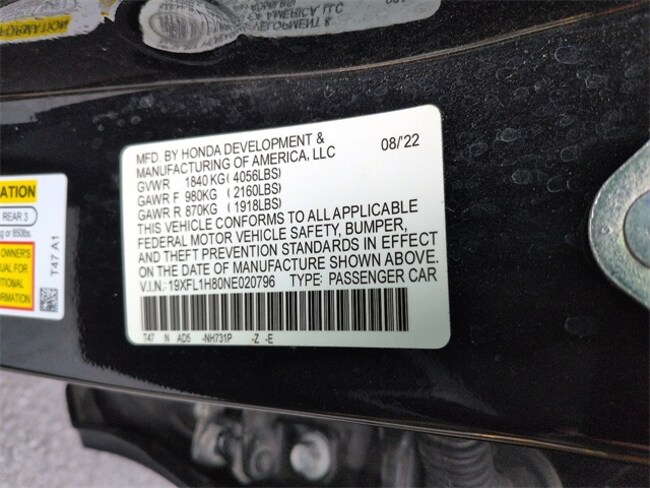 - VIN : 19XFL1H80NE020796